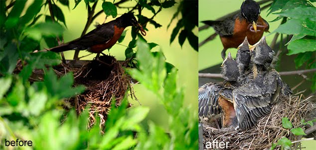 Recently, I stumbled across a momma bird hatching 4 eggs, I shot with 3 cameras over a 5 day period. Two hours into the shoot, I realized that I was losing 70% of my photos because of dead branches and vines in the way. I proceeded to do a “Joe DiMaggio Photoshop,” which consisted of a 6ft ladder, and some pruning shears. I cleaned up the composition. New idea? I don’t think so!