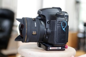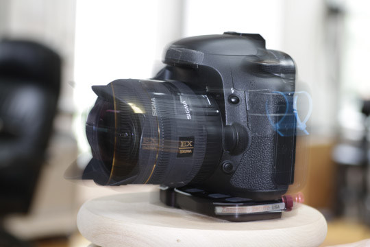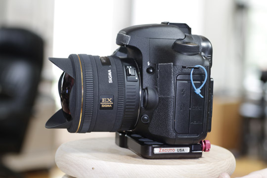 Recently, I had the opportunity to do a 360 degree panorama in an extremely tight space. I stripped everything down to a bare minimum and decided to triple-shoot it, HD video, with three different cameras. A medium large, DSLR, a Hero Go-pro, and an iPhone 4G. I discarded the iPhone immediately because I couldn’t fabricate a bracket fast enough. The Go-Pro and the DSLR were placed flush on a lazy susan, which I quickly fabricated from two pieces of wood I had in the studio, and a teflon/ball bearing LS. I didn’t have time to embed a 1/4 20. So I reached into my bag of tricks, took out a piece of modeling clay, and temporarily cemented the camera to the lazy susan. Clean, simple, inexpensive…Oh yeah, and it works. When you try to remove the camera, it’s almost like it’s cemented to the turntable. But once it pops up, a little bit of denatured alcohol, and it’s clean as a whistle. Don’t get it in the hole for the 1/4 20! It will take a little time getting that out.. and as we all know, time is money.