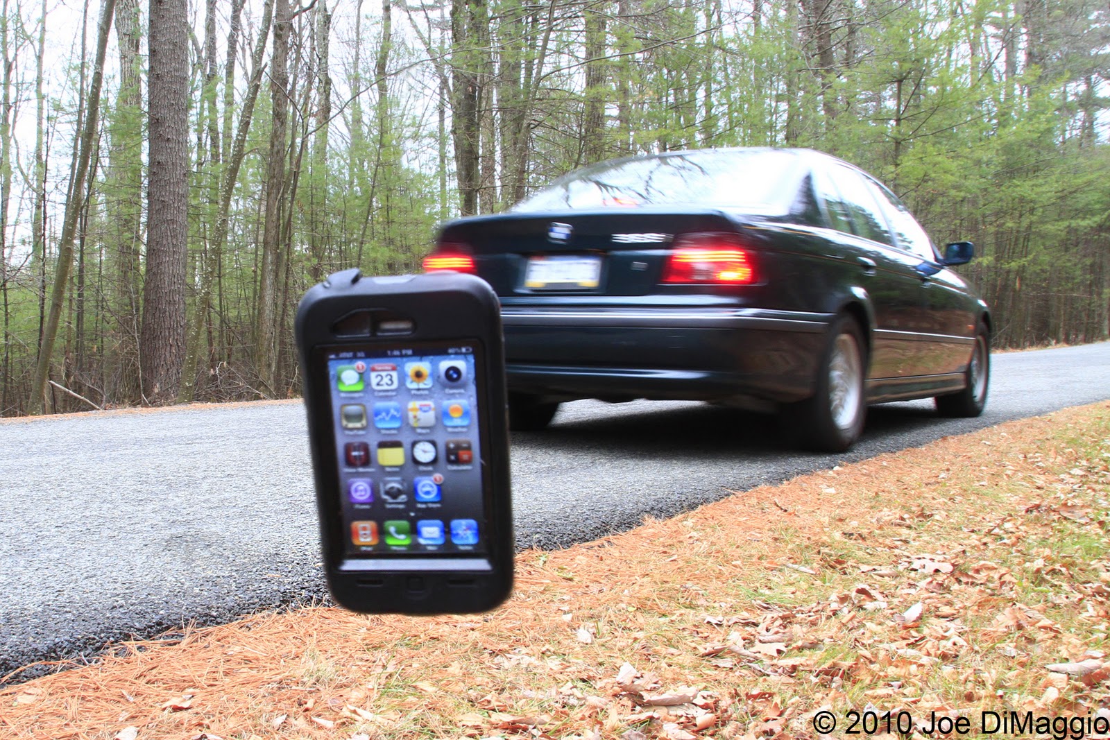 Our son insisted that my iPhone be encased in a heavy duty Otter box case because I am sometimes tough on my phone. I guess that was a good thing because yesterday I went to physical therapy for almost two hours then came back and decided to take me best friend Ace for a three mile walk. Getting into the car I decided to take his bell off, but my hands were full so I placed my iPhone on the roof of the car. I drove the four and half miles home, went in, and went back to the studio for some editing work. Dylan was just back for a visit after being out at sea for a month filming tuna fishing. He took the car downtown to get the mail, I didn’t think anything of it but he was gone for an hour and a half. He walked in and said something to the effect that there was a minor problem with an iPhone. Told him that if he broke his company iPhone I was not going to replace it (he has the iPhone 4). He then began to tell me on his trip back he heard a scratching sound and then a thump, the phone hit one of the struts on the roof rack before it decided to fly out at 60mph on route six. My son looked into the rear view mirror when he hit the bump and he saw the phone hit the pavement and preceded to do a Nascar tumble, all this time I’m thinking its his phone, and I’m not happy. Then he informed me it was my phone. He handed back to me a phone without a mark on it, the case was a little chewed up but it worked perfectly. It wouldn’t allow me to make any phone calls but with ATT that was normal.
