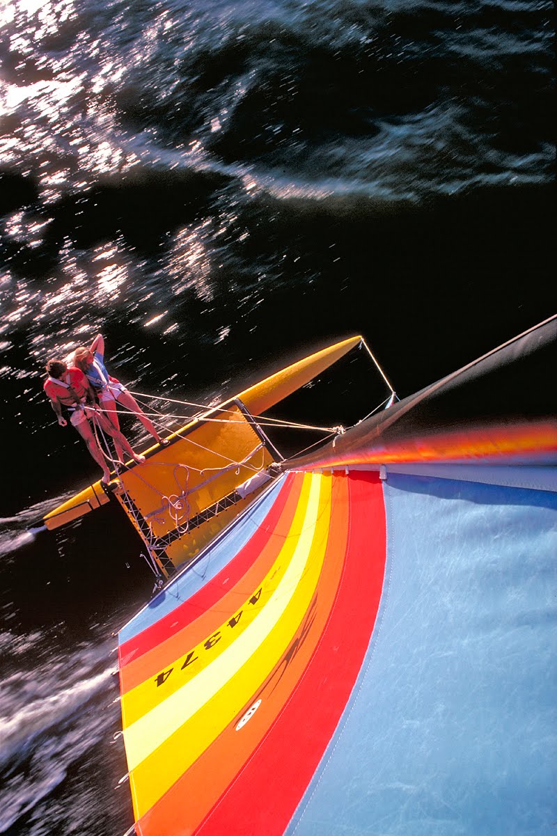 “This Hobie Catamaran photograph above was done with a Singh-Ray polarizing filter — and Kodachrome 25 film — a few years before the ‘lighter, brighter’ version came out. The polarizer really helped me cut glare to get all the color that Kodachrome was famous for. It was taken from the top mast on a Hobie 16. Living on the sea afforded me a window of Northport Harbor. Watching the boats pass by was like a ballet of color and contrast. I made friends with one of the captains and photographed from one boat to another, but I was soon looking for a different perspective. I tried to talk one of the catamaran captains into modifying his boat for my photo. He was interested in seeing the photograph, but had no interest at all in modifying his boat. So to solve my problem, I went out and bought a brand new Hobie 16, drilled a hole in the top of the mast and mounted my camera to the mast and used a radio control tripping device. To tell the truth, John Zimmerman from Life Magazine did a photograph of a docked sailboat from the Bosen’s chair, which I always admired. His image intrigued me but I wanted to add color and motion to my version. In the final analysis, we have to thank all great photographers for the inspiration they provide us to make our own images.