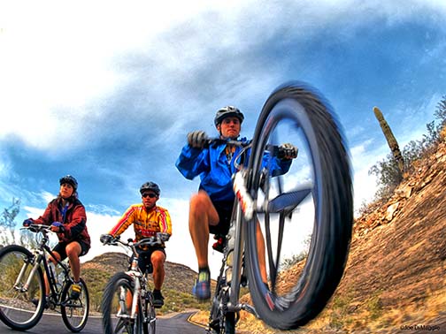 While working on an essay called America, I came across some college students at the U of A who were heavy into mountain biking. We did all of the classic cliché photos and then I decided we can do better. So I took one of the small Canon cameras with a 15mm lens and a remote cord and put it at the end of a painters pole and was actually able (for a millisecond) to get the camera under the tire as the young man did a wheely.